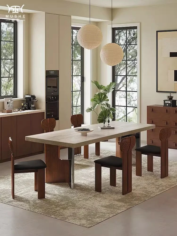 French Vintage Solid Wood Rock Slab Dining Table - Foldable, Round & Square Design for Small Spaces, Minimalist Dining Set with Chairs for Home Use