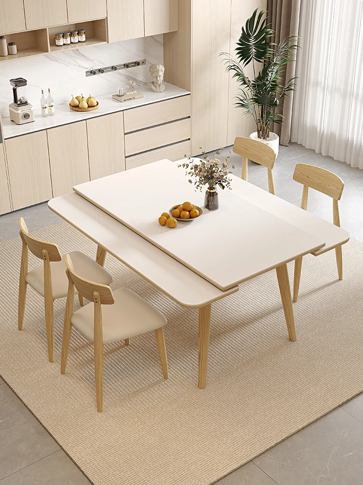 クリーム風の伸縮式岩板ダイニングテーブルセット - 家庭用小型折りたたみ方卓、実木製の折りたたみテーブルで空間を有効活用!おしゃれで機能的なデザインが魅力です。