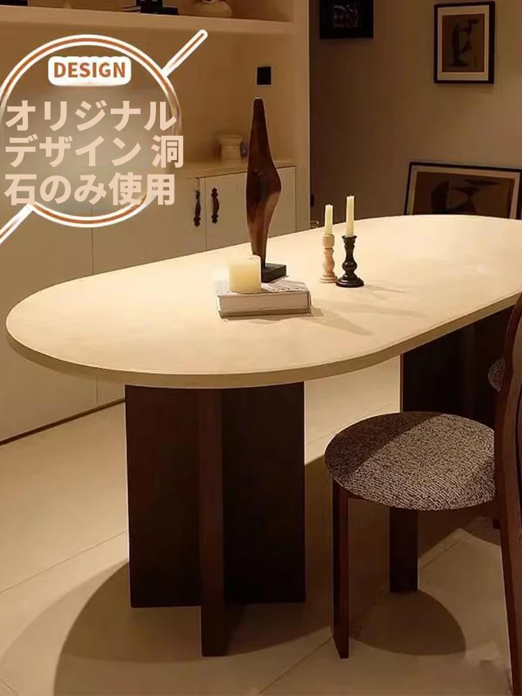 ヴィンテージスタイルの風洞石ライムストーン・オーバル型リビングルーム用無垢材ダイニングテーブル、フレンチクリーム風の贅沢な家庭用ストーンテーブル。おしゃれで温かみのある空間を演出!