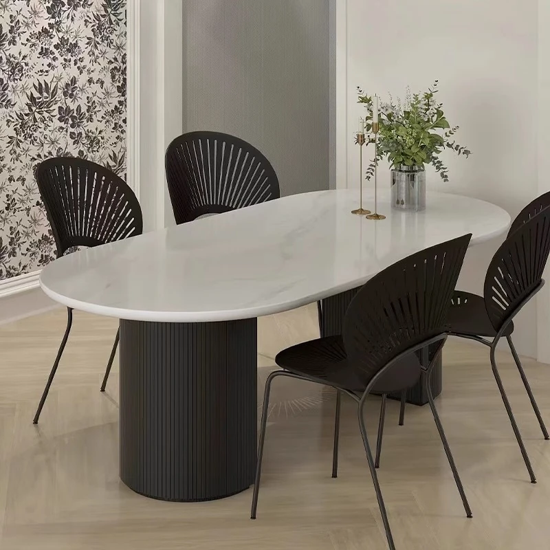 Elegant French Marble Dining Table Set with Chairs - Nordic Minimalist Design for Small Spaces, Featuring Stylish Solid Wood Oval Table, Perfect for Modern Living.