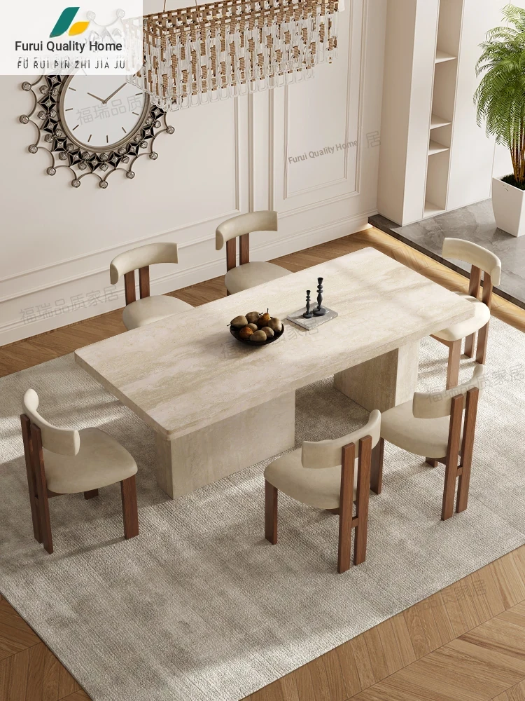 French Rustic Solid Wood Rock Plate Vintage Luxury Dining Table - Minimalist Cream Style for Small Spaces, Perfect for Home Use with Matching Chairs