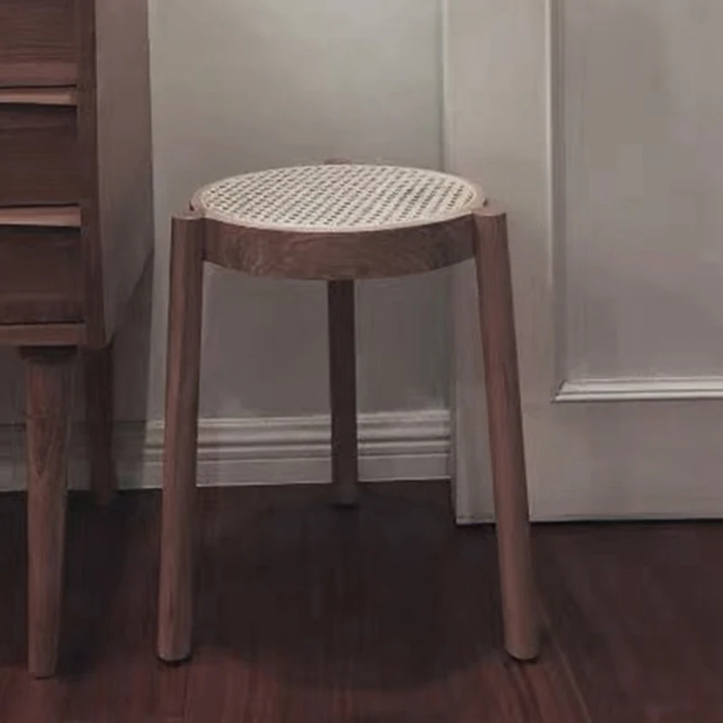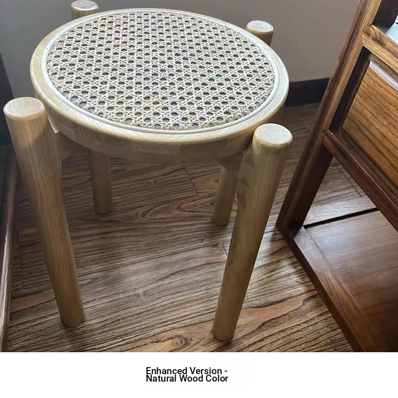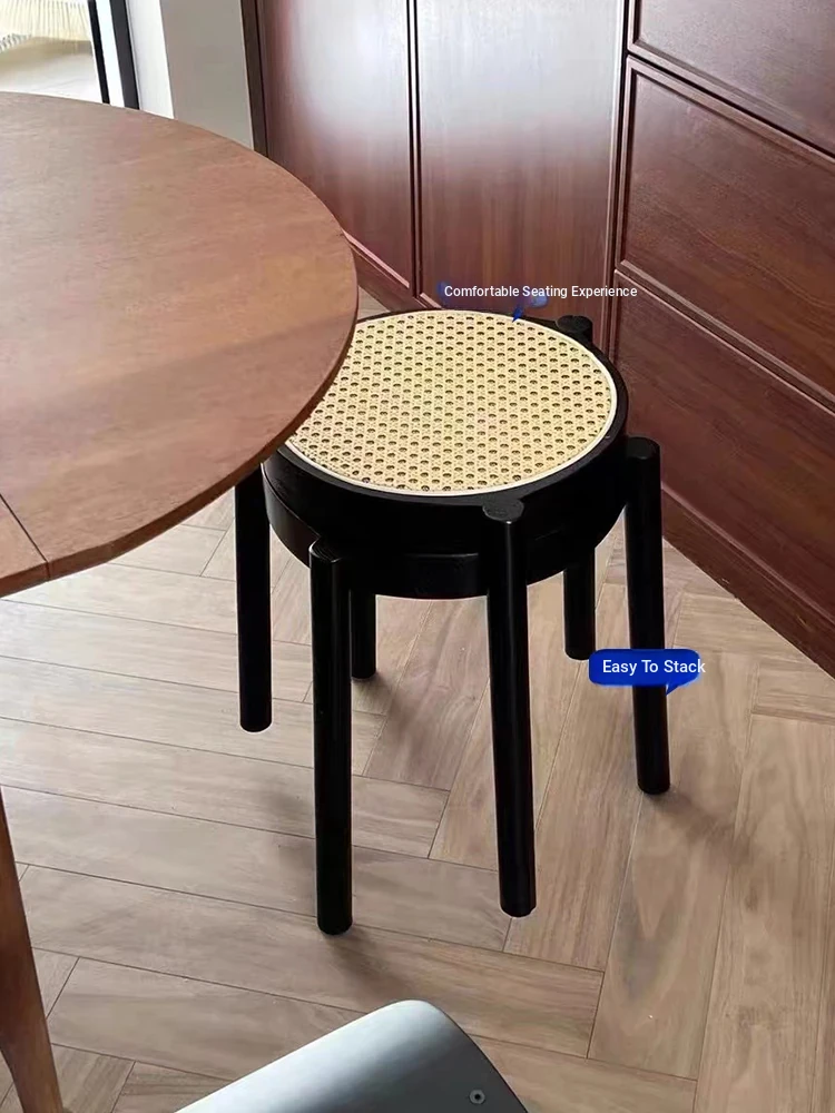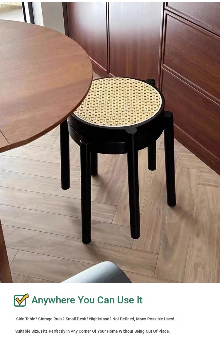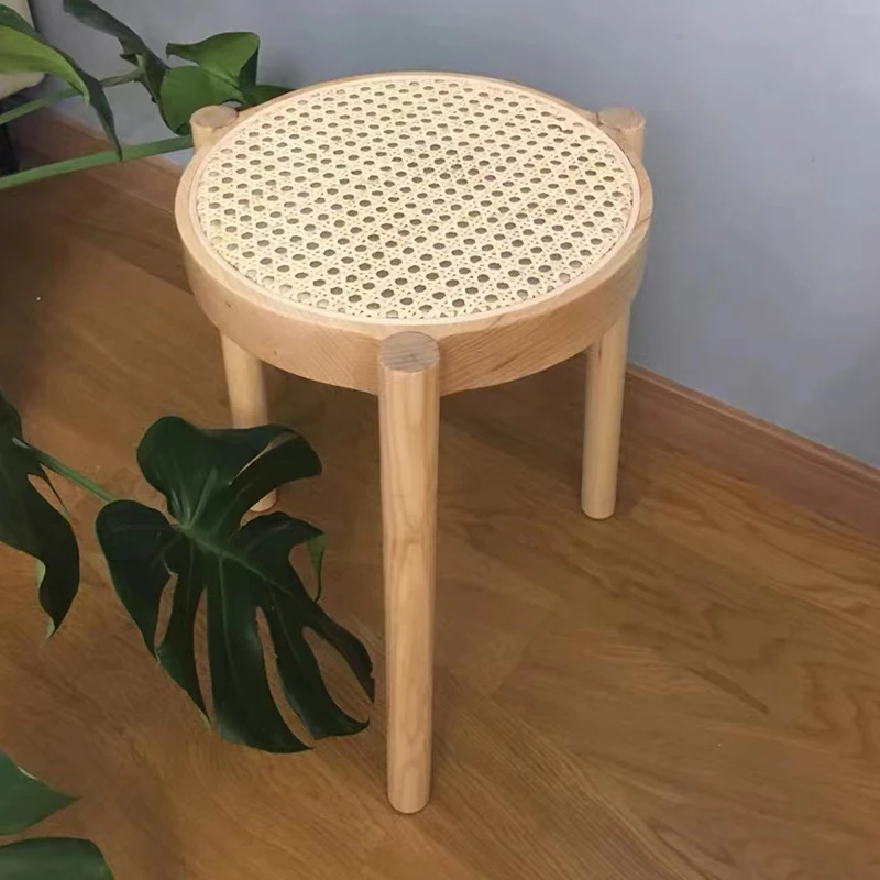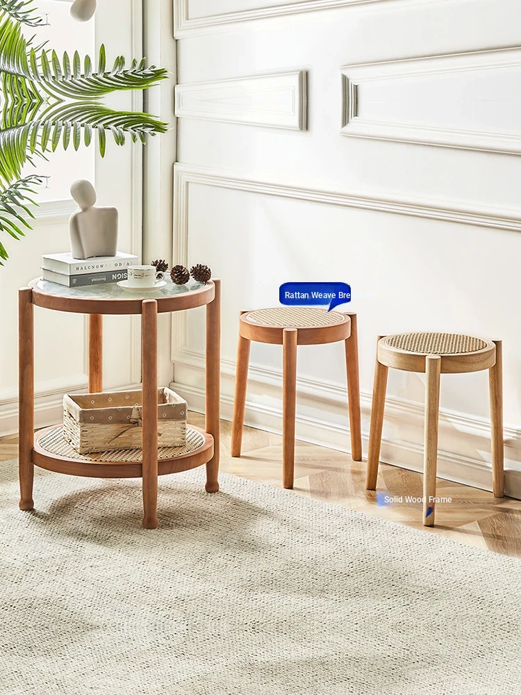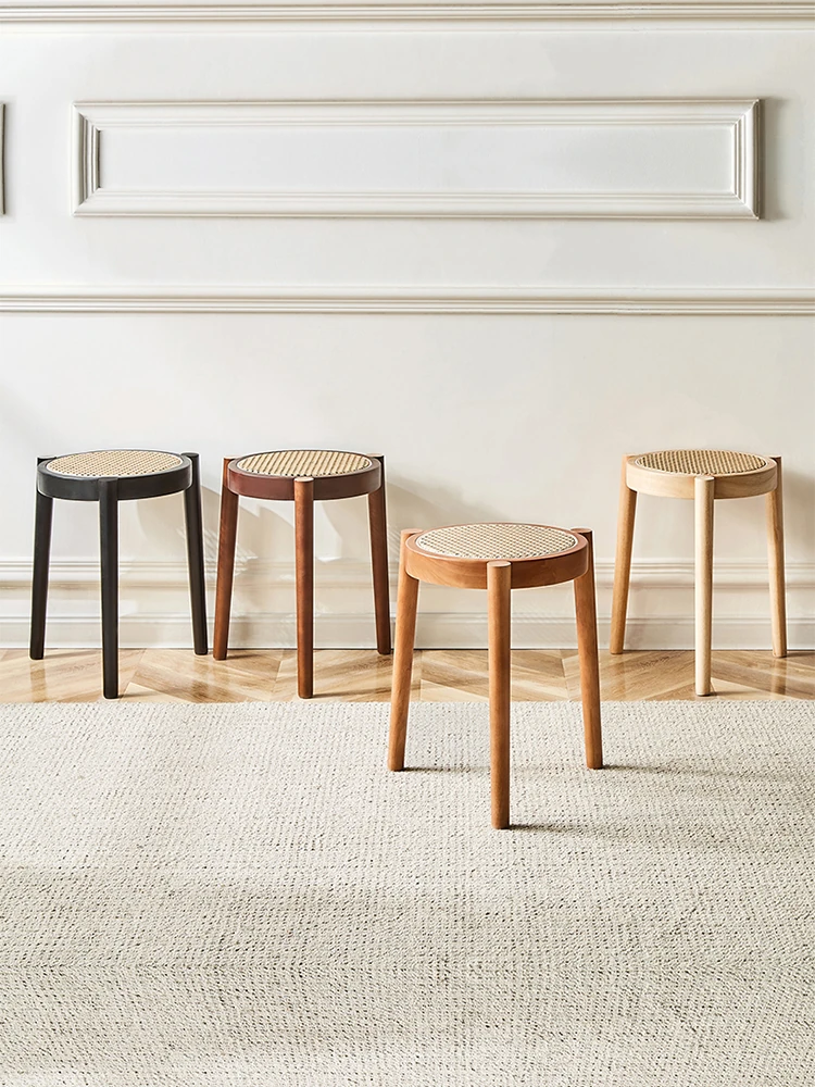 Nordic Solid Wood Minimalist Rattan Woven Round Stool - Stylish and Versatile Makeup Bench, Light Luxury Stacking Footstool for Home Use, Perfect for Shoe Changing and Relaxation