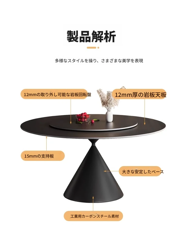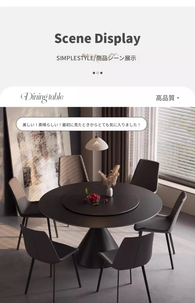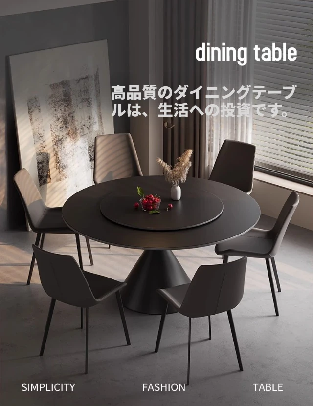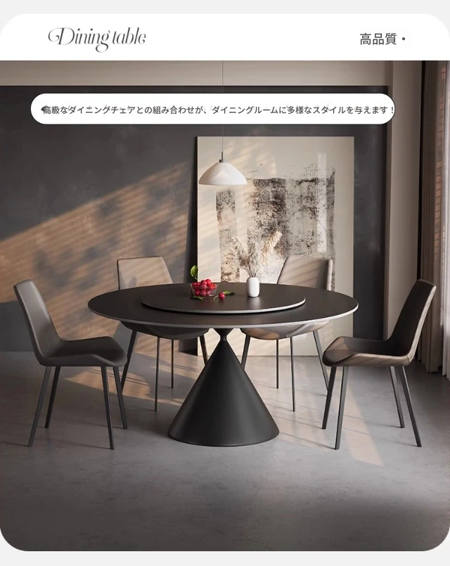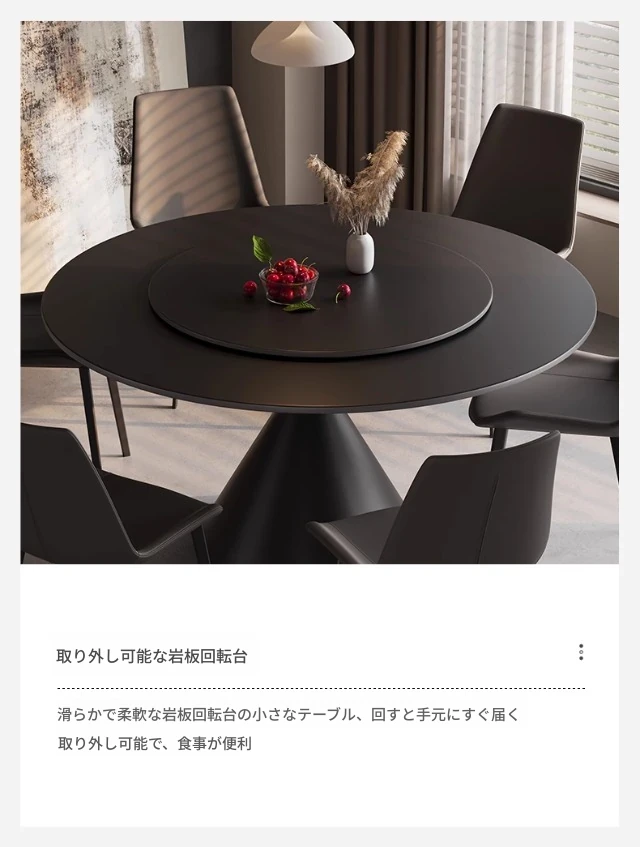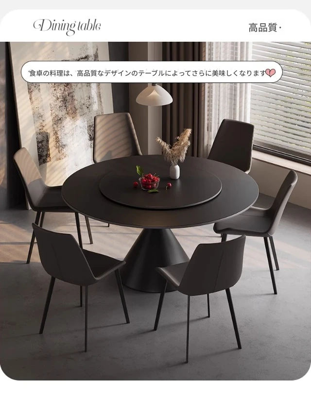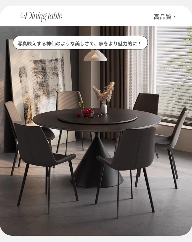 軽やかなラグジュアリー!円形の岩板ダイニングテーブル&チェアセット、モダンでシンプルなイタリアンデザイン。回転プレート付き、小さなお部屋でも使える理想的な食卓です。