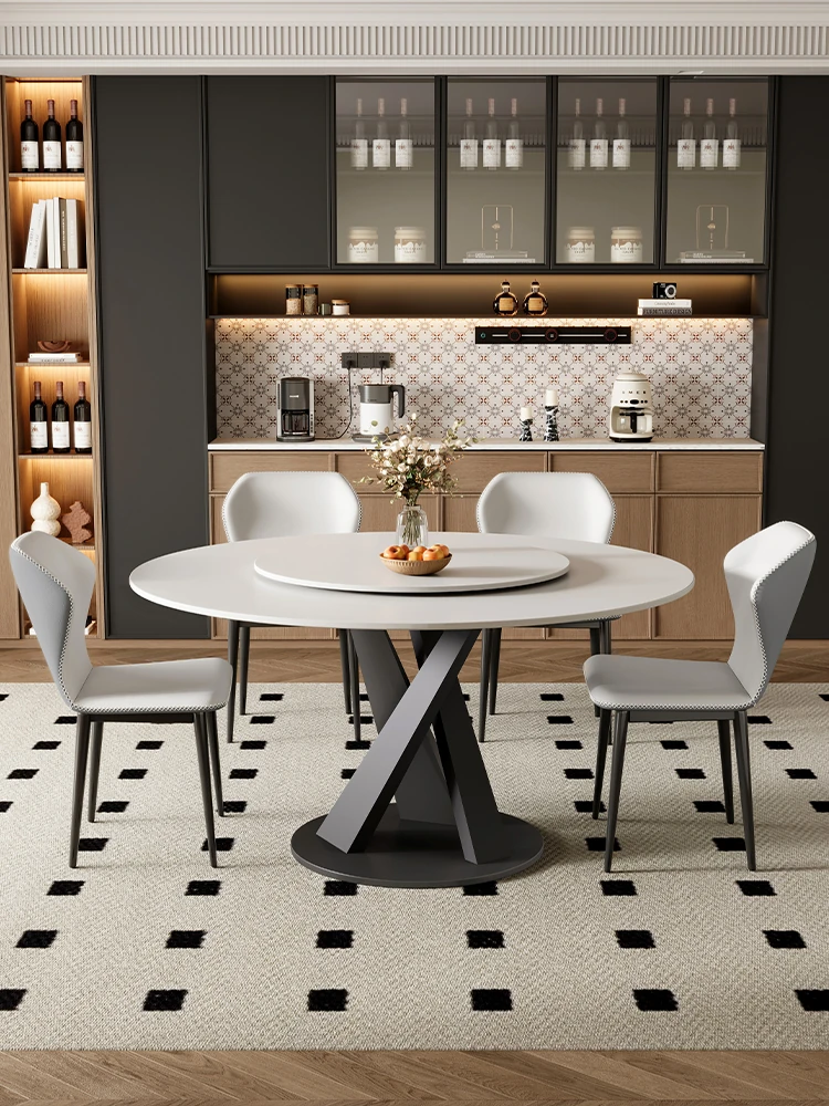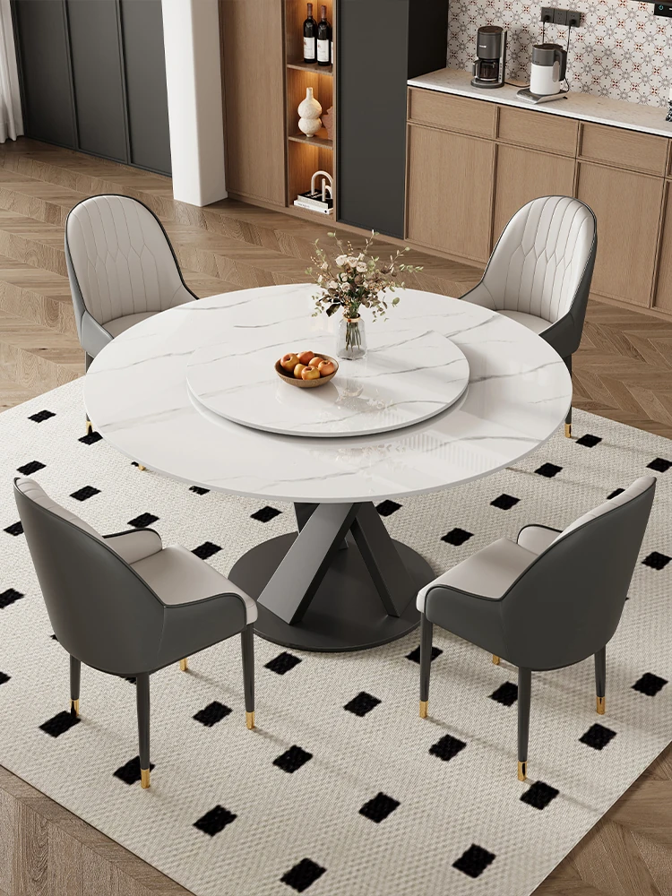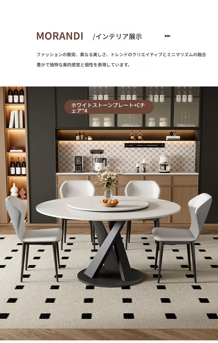 イタリアンスタイルの光沢仕上げラウンドダイニングテーブルセット、回転プレート付き!小型住宅に最適な軽奢華でモダンなデザイン。食事を楽しむための理想的な組み合わせ!