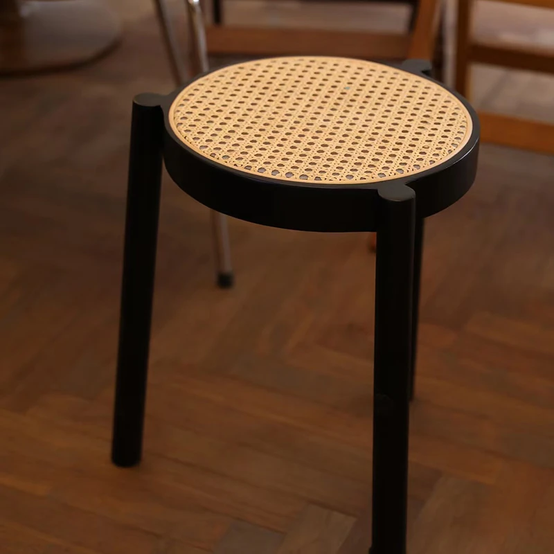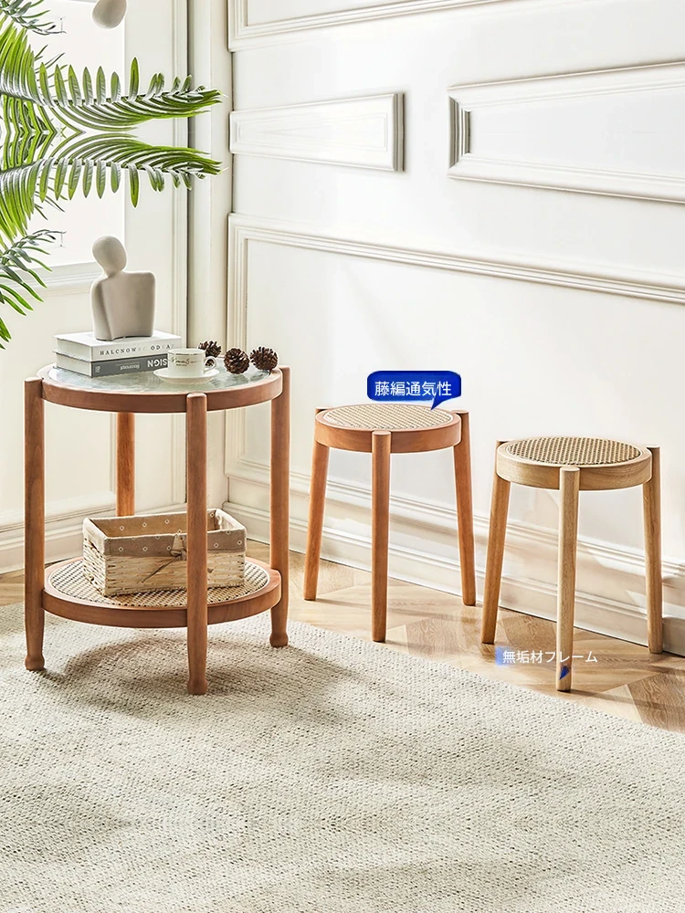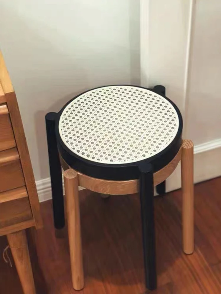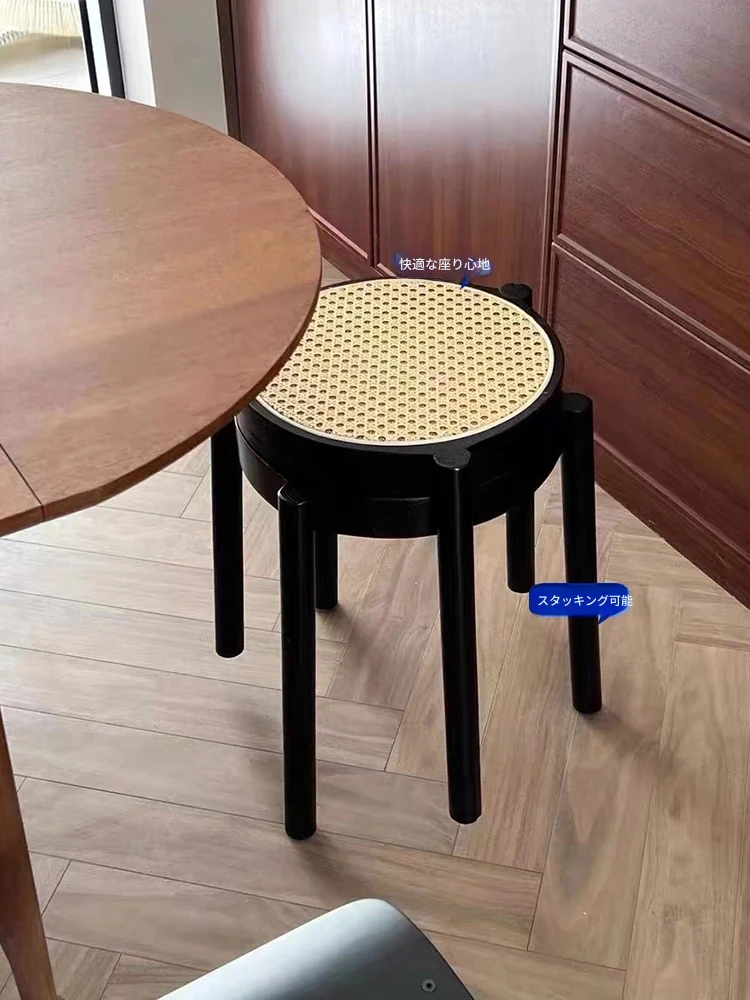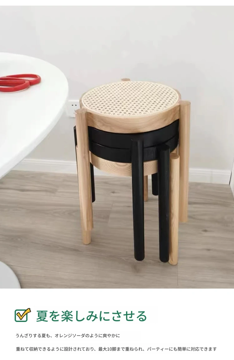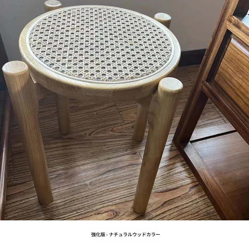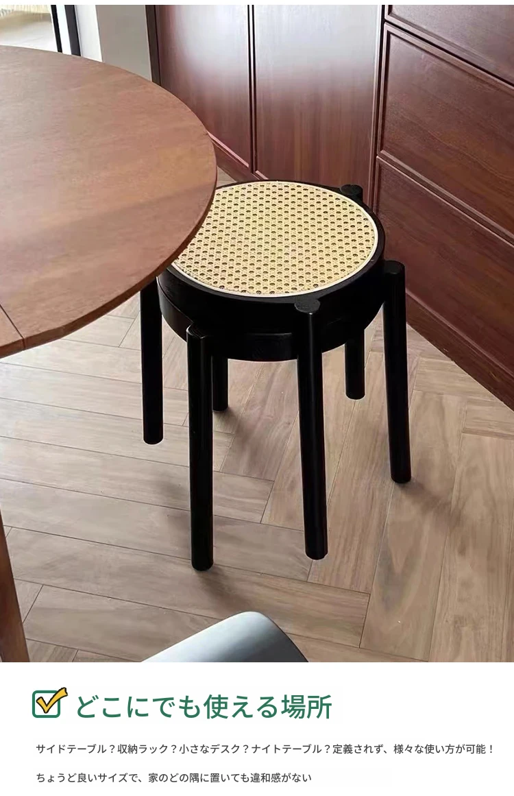 北欧風シンプルな無垢材とラタン編みの丸型スツール|リラックス&メイクアップに最適|軽やかでスタッキング可能|おしゃれな靴替え用ミニスツール