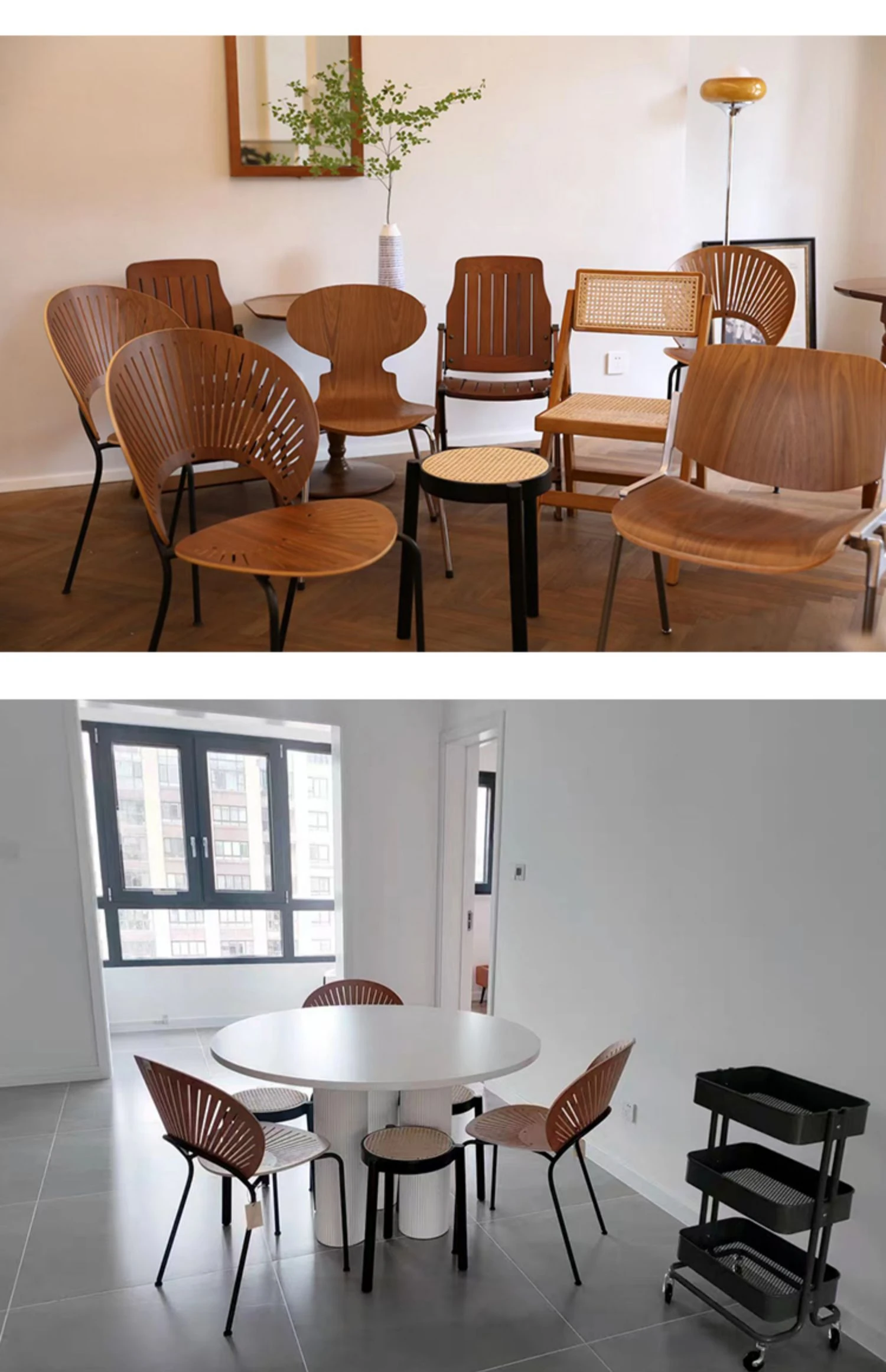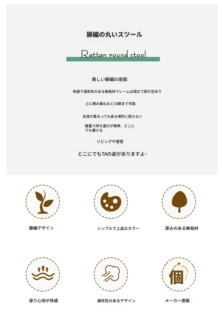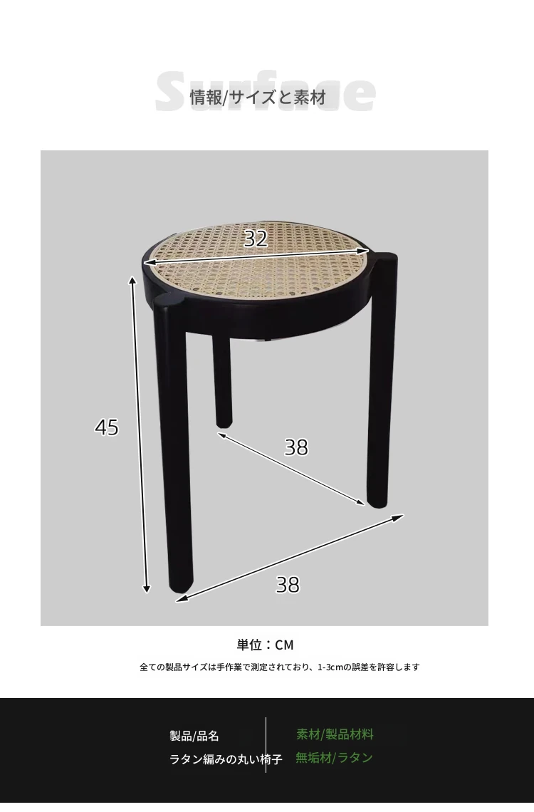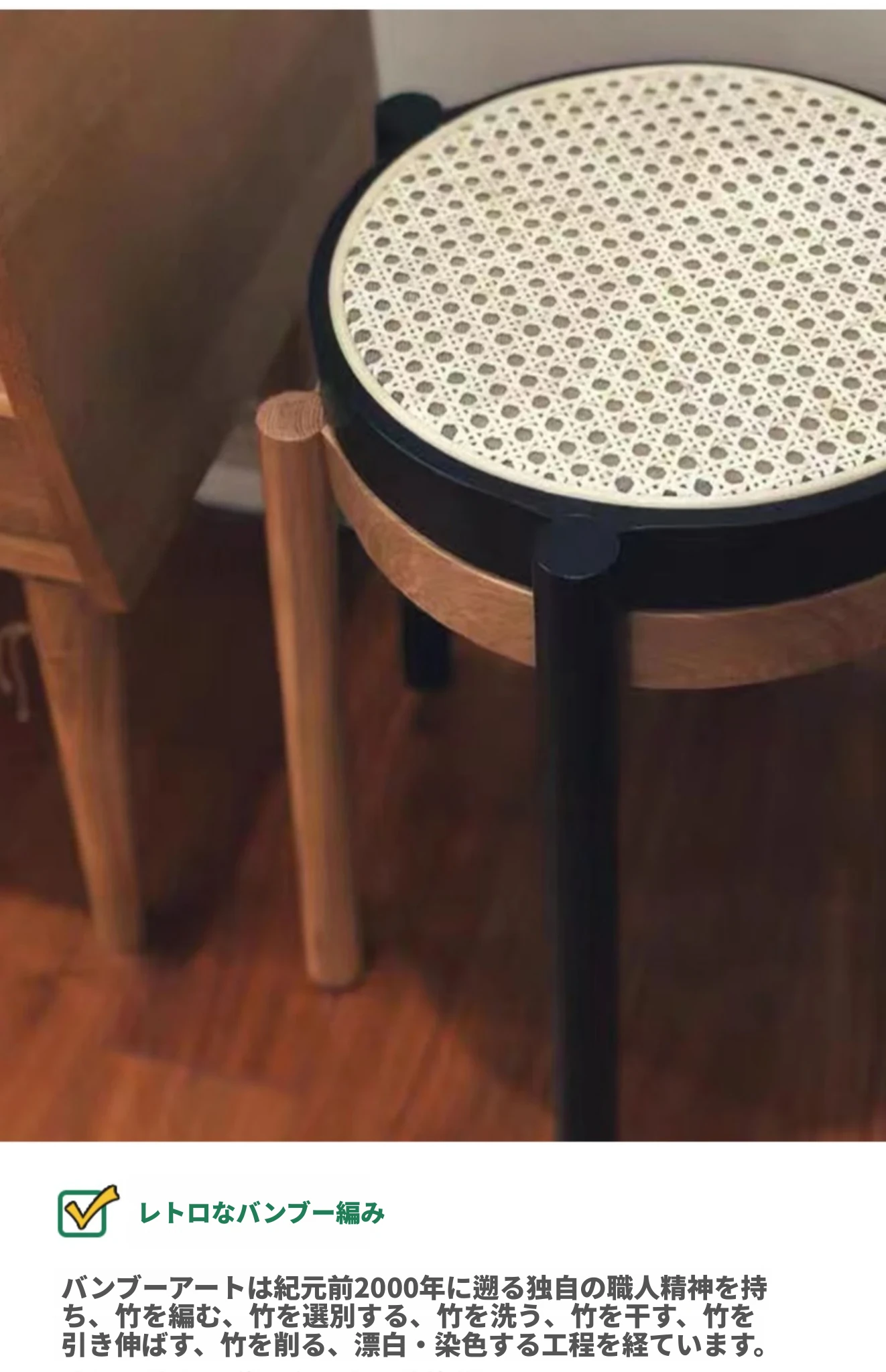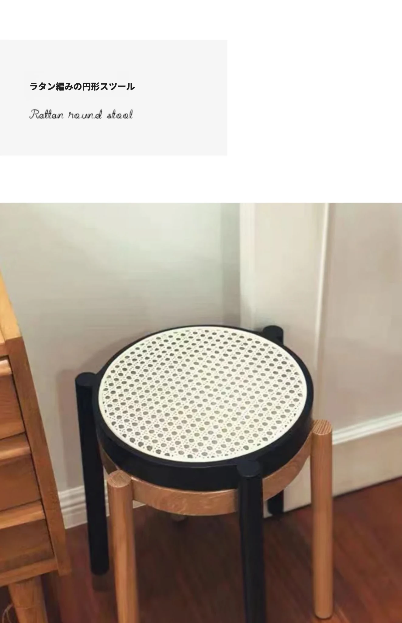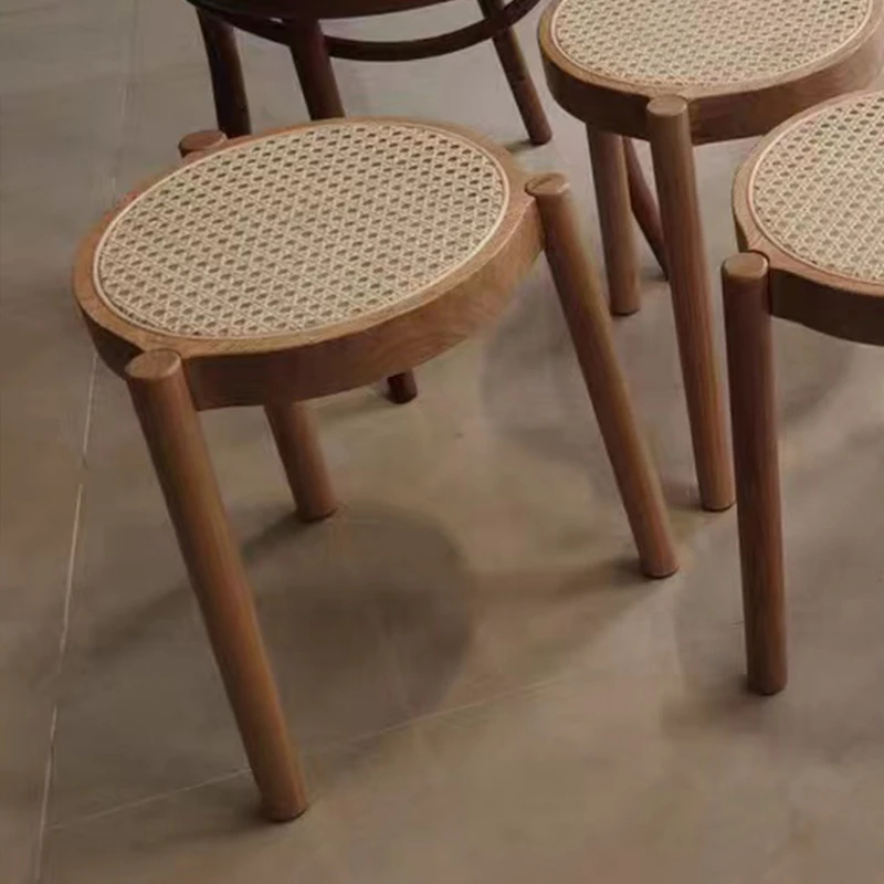 北欧風シンプルな無垢材とラタン編みの丸型スツール|リラックス&メイクアップに最適|軽やかでスタッキング可能|おしゃれな靴替え用ミニスツール