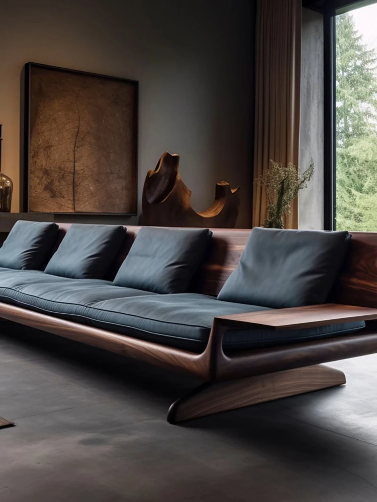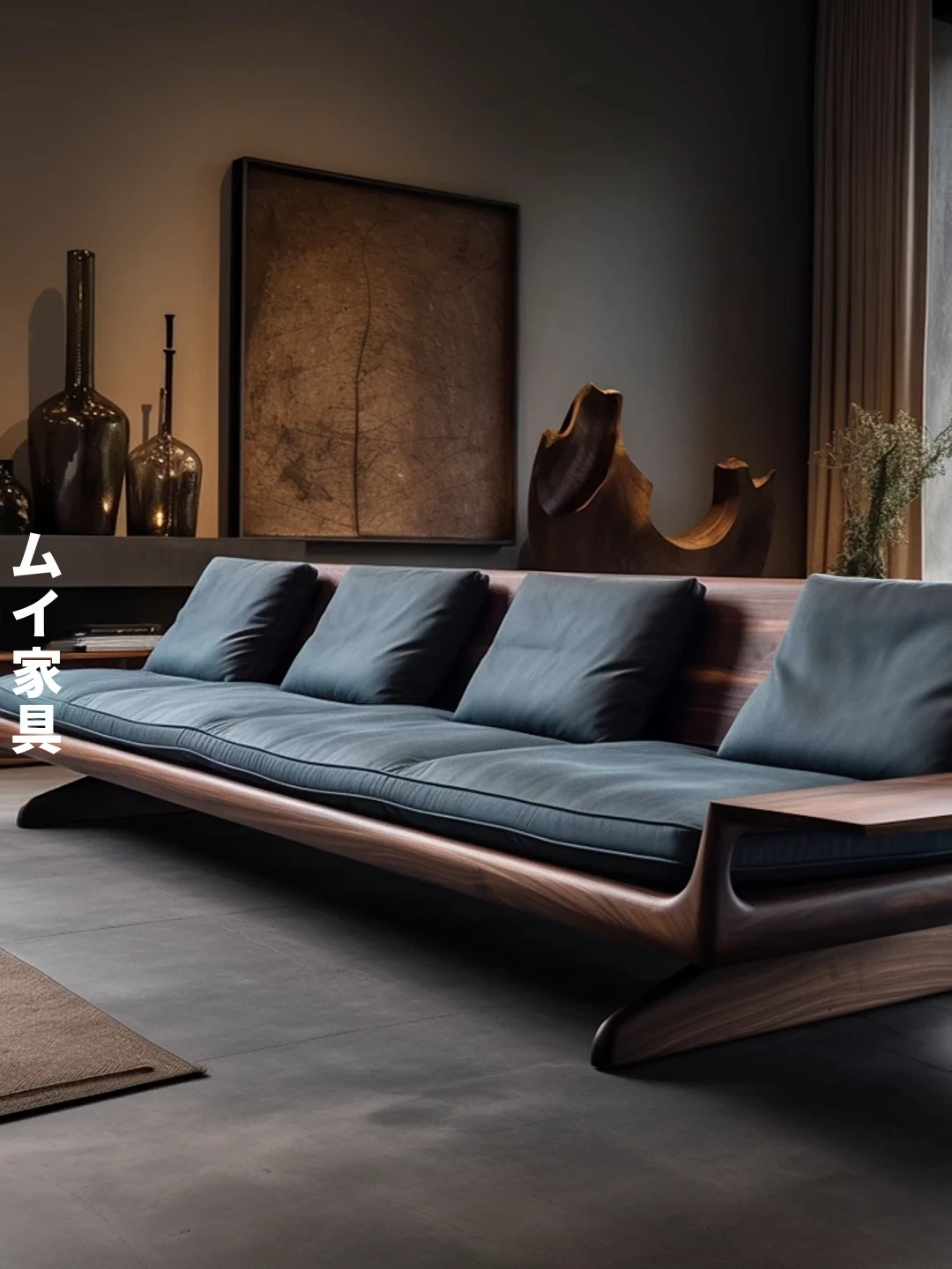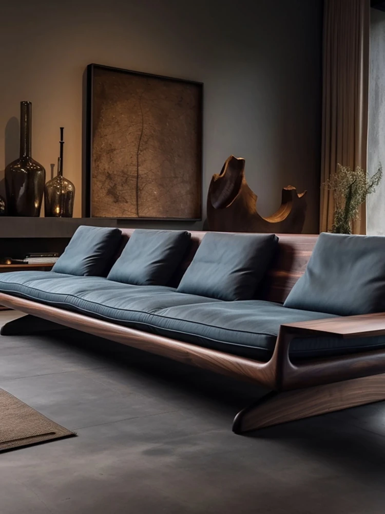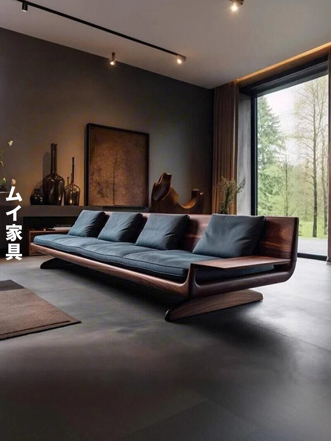 北米産ブラックウォールナットのミニマリスト布製ソファ|モダンでシンプル、ラグジュアリーなデザインの無垢材製3人掛けソファ|別荘やリビングにぴったりな洗練されたスタイル!