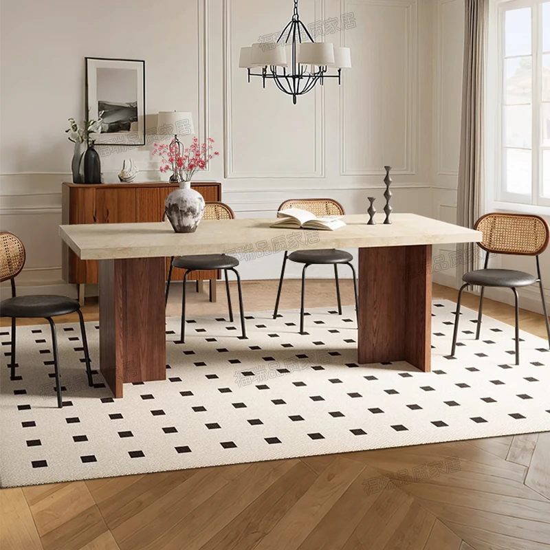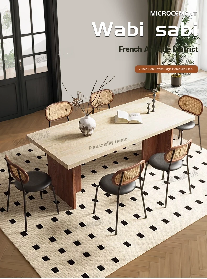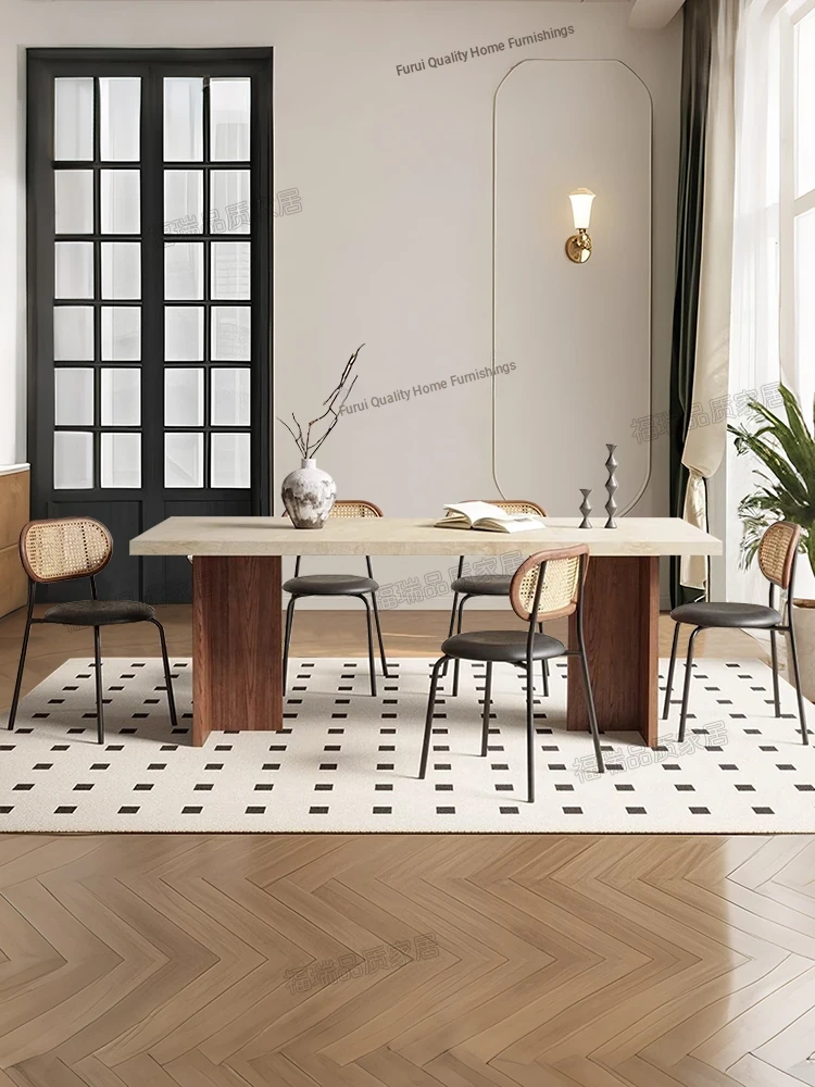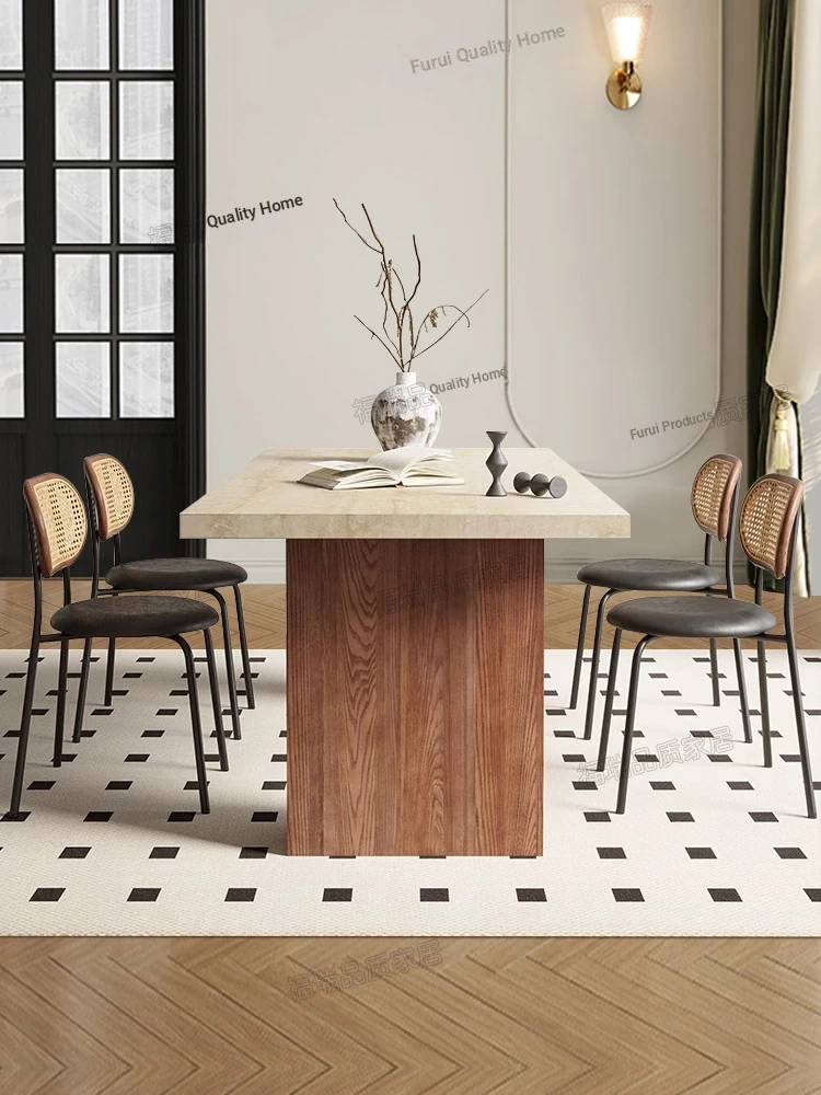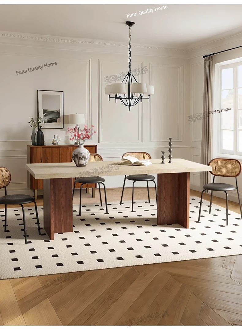 Solid Wood Hollow Stone Dining Table and Chair Set - French and American Vintage Style for Home, Perfect for Living Room and Dining Room, Rectangular Design