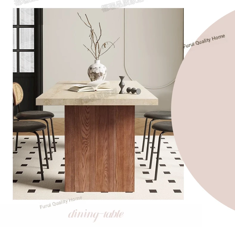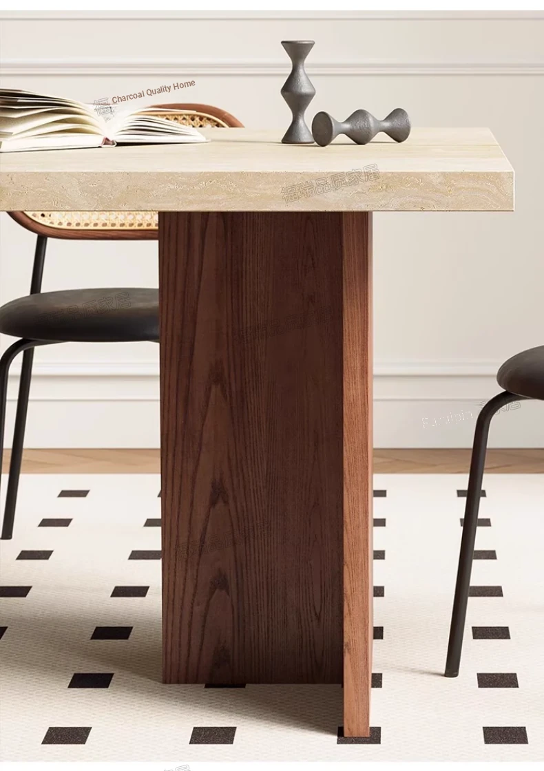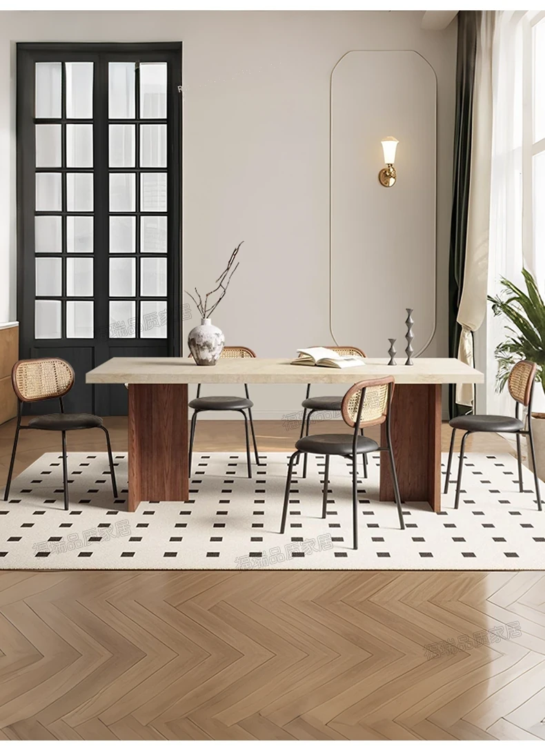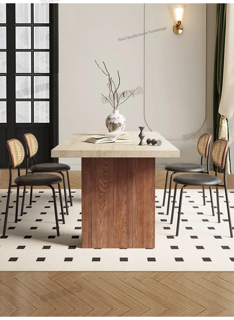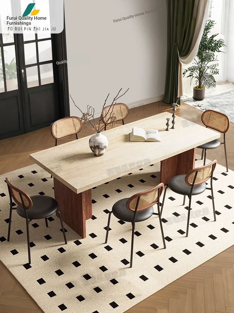Solid Wood Hollow Stone Dining Table and Chair Set - French and American Vintage Style for Home, Perfect for Living Room and Dining Room, Rectangular Design