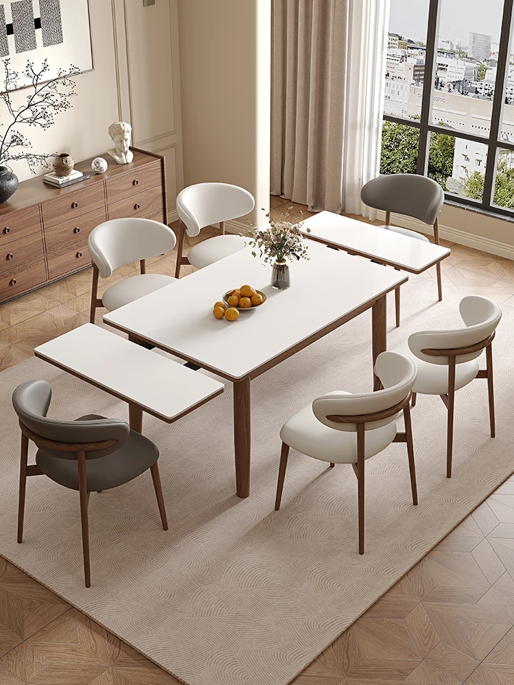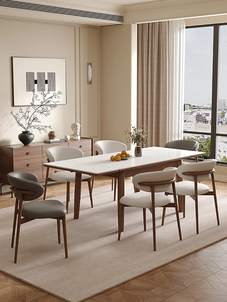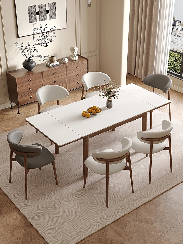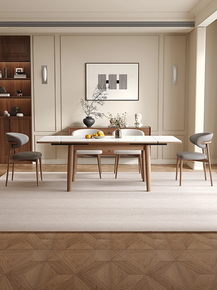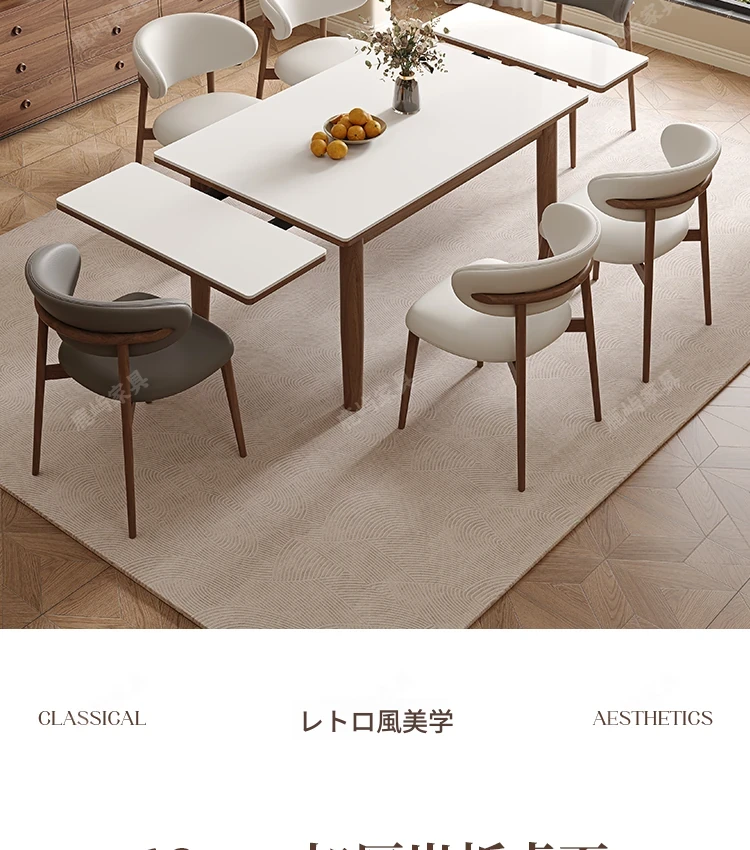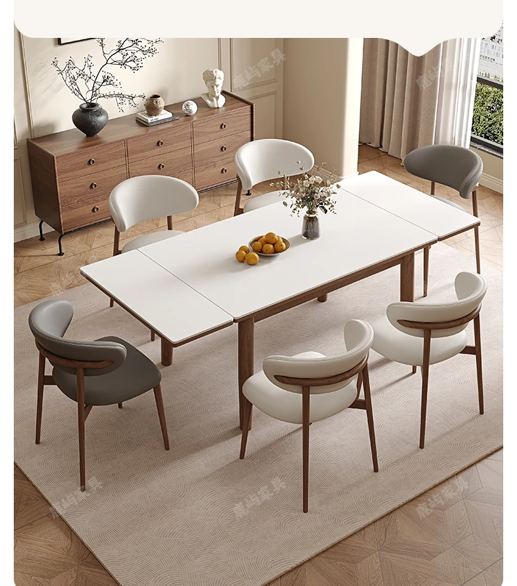 中古風の伸縮可能な折りたたみ式デリフォン岩板ダイニングテーブル - シンプルでモダン、小型住居に最適な長方形ウッドウォールナット色テーブル!使い勝手抜群で、インテリアにもぴったり!