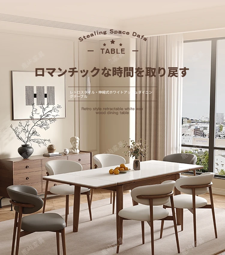 1.2メートル伸縮1.8メートルデリフォン岩板ダイニングテーブル+6椅子 【ホワイトアッシュ木フレーム+全面無垢材底板】