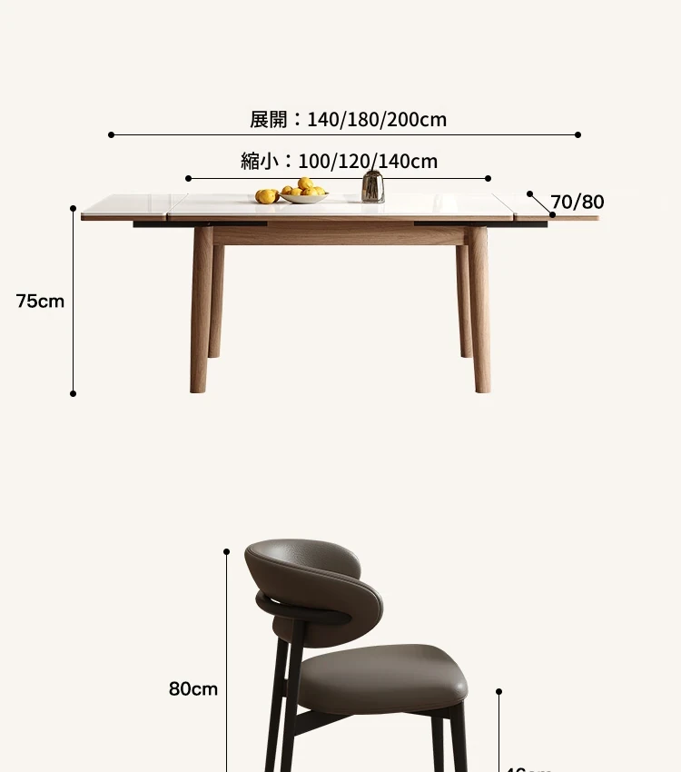 1.2メートル伸縮1.8メートルデリフォン岩板ダイニングテーブル+4椅子 【ホワイトアッシュ木フレーム+全面無垢材底板】