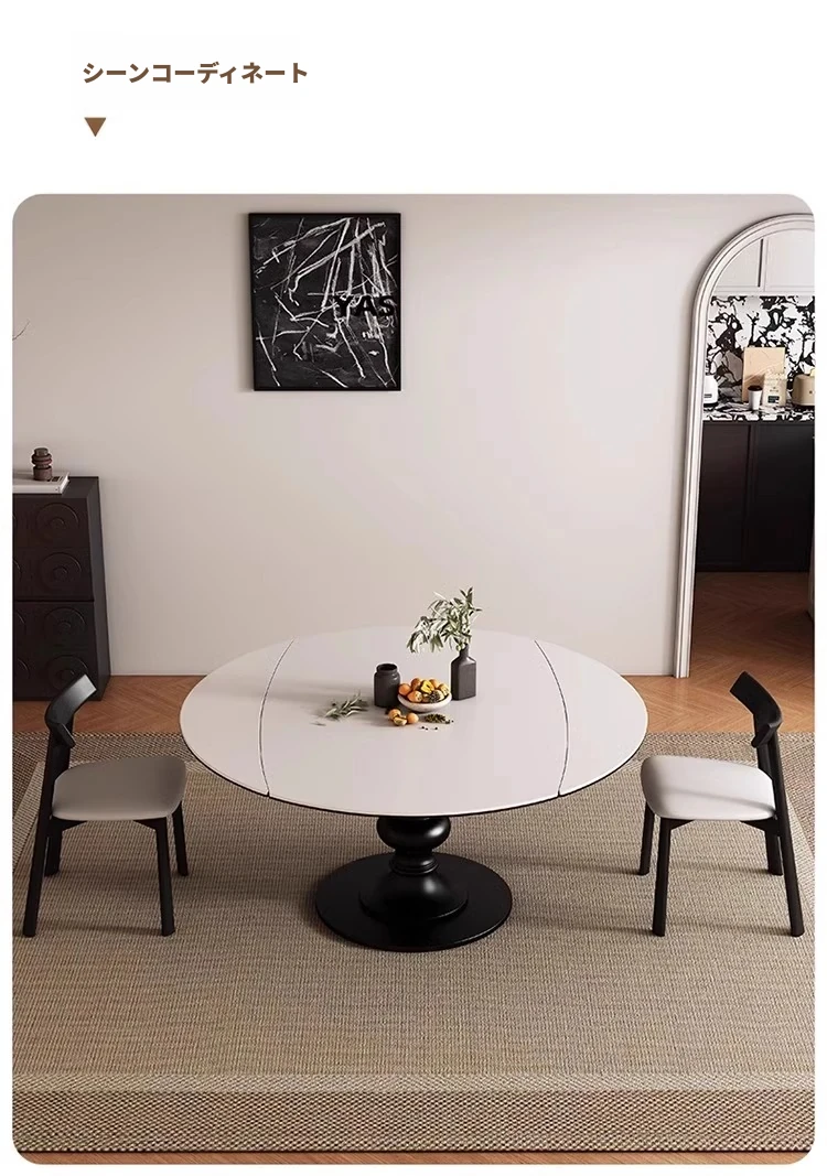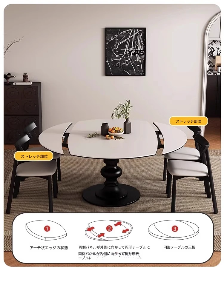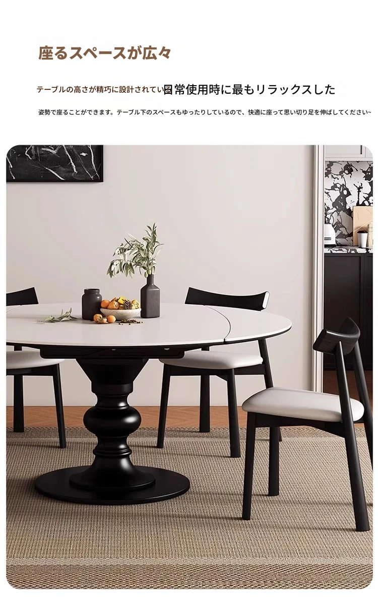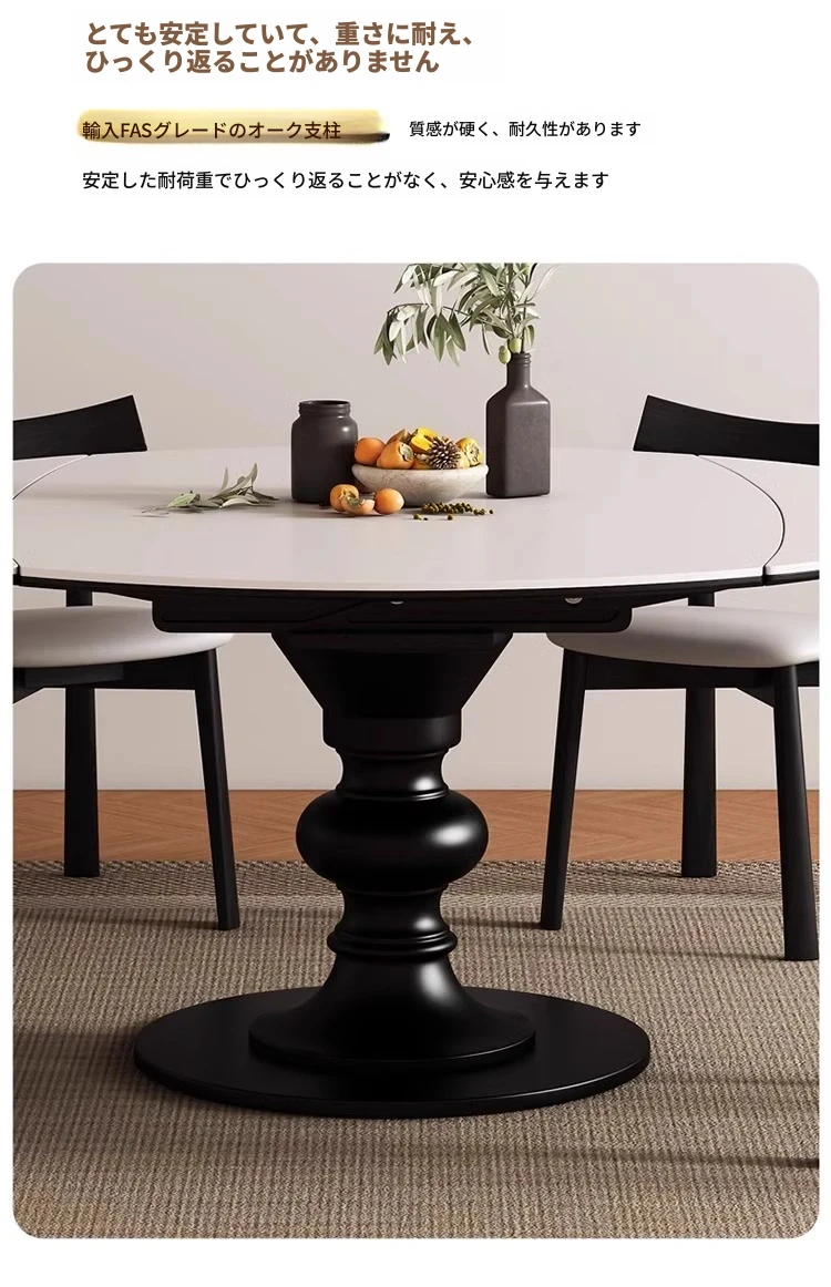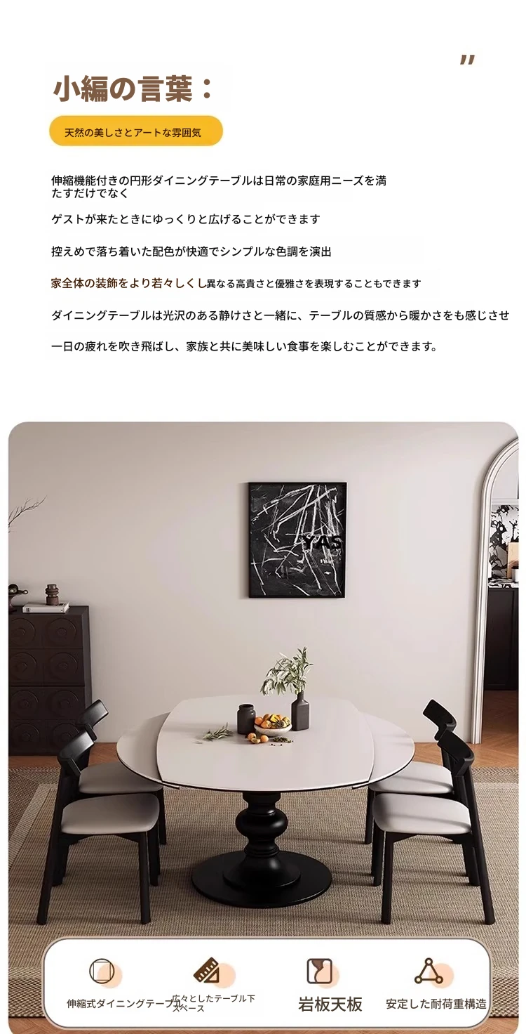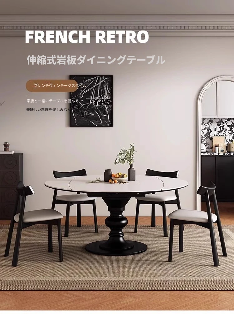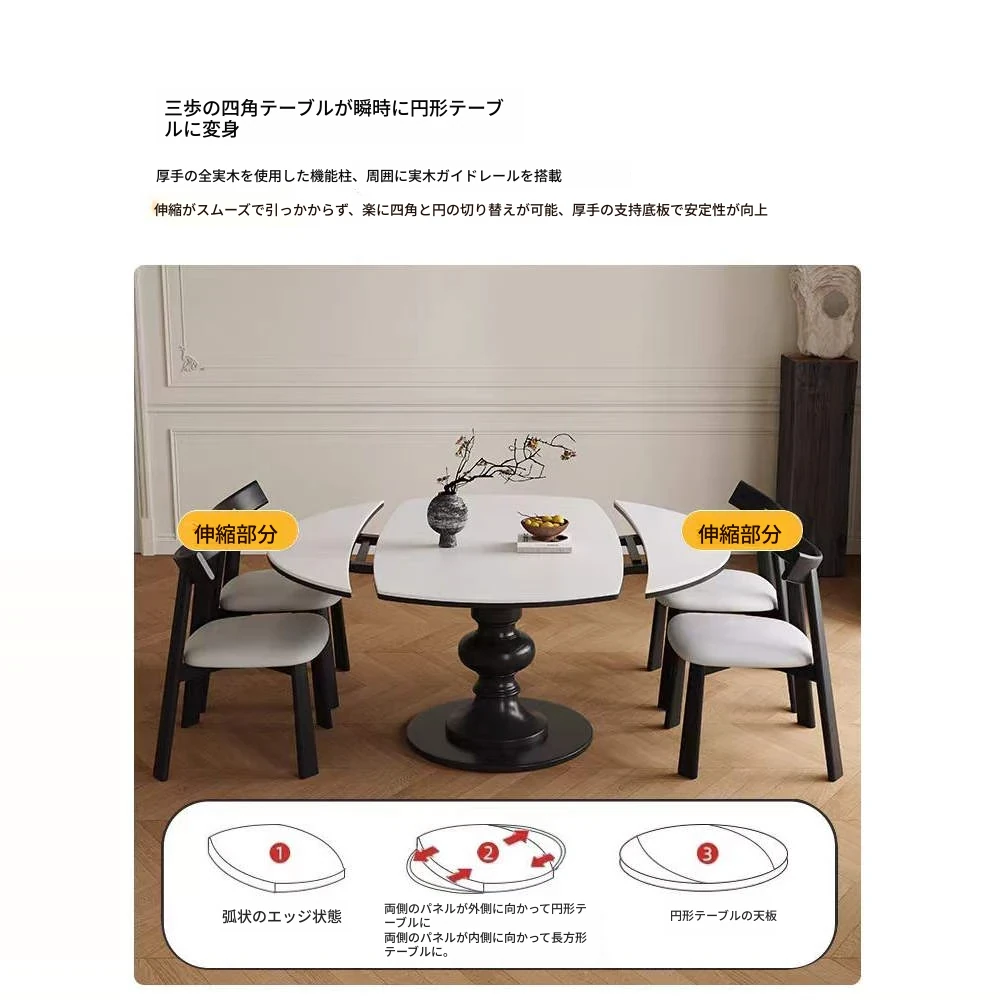 ヴィンテージ風の伸縮可能なラウンドダイニングテーブル - 高級感溢れるフレンチスタイル、小スペースに最適なスクエア&ラウンド両用、耐久性のある無垢材とロックストーンの洗練されたデザイン!