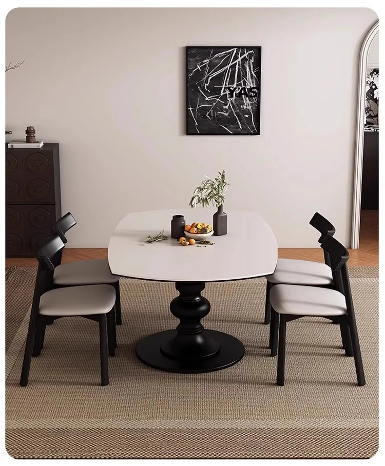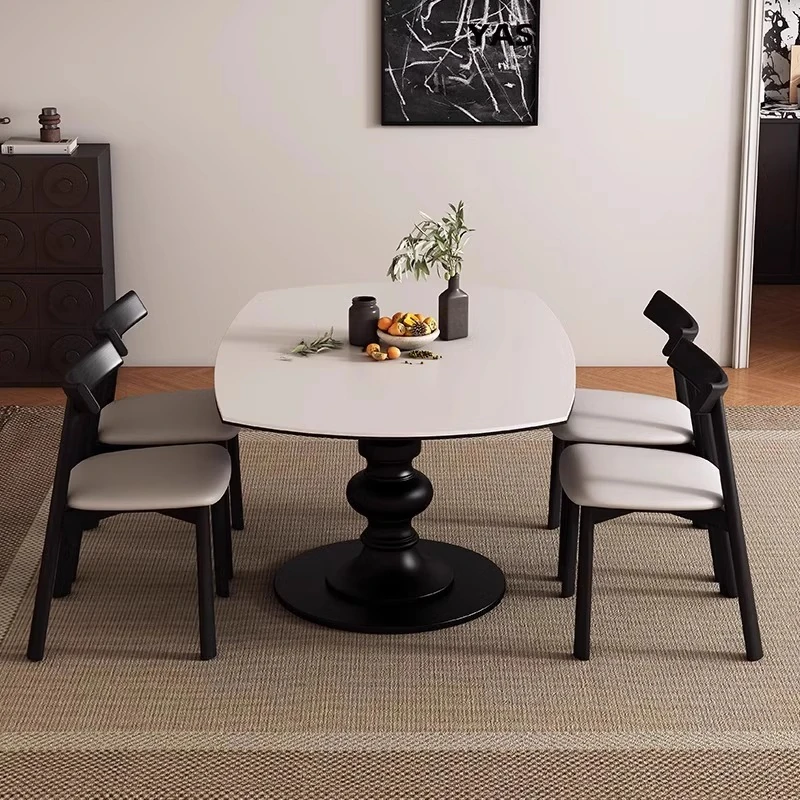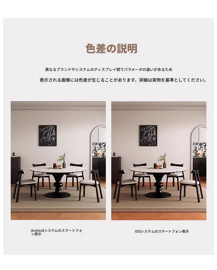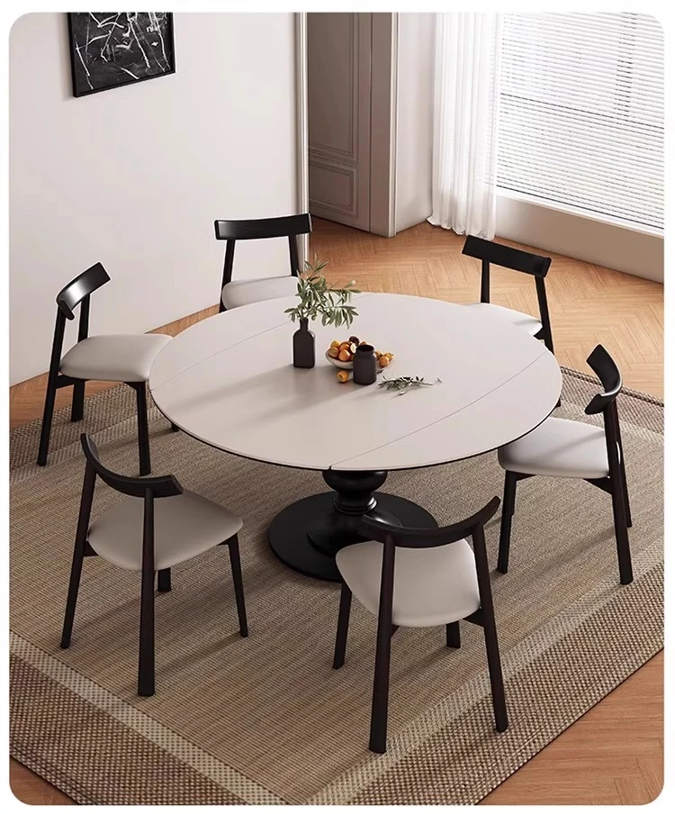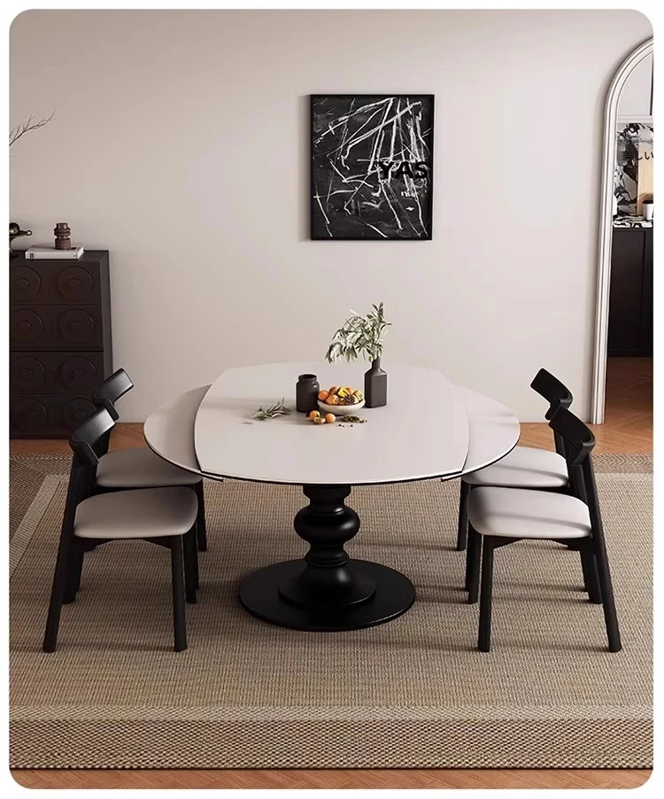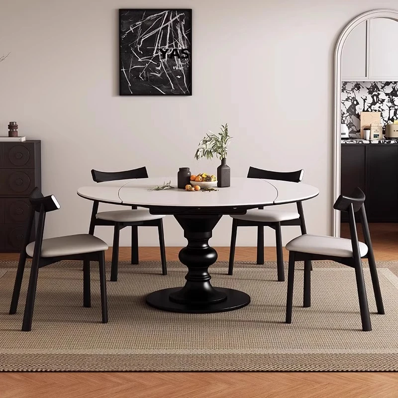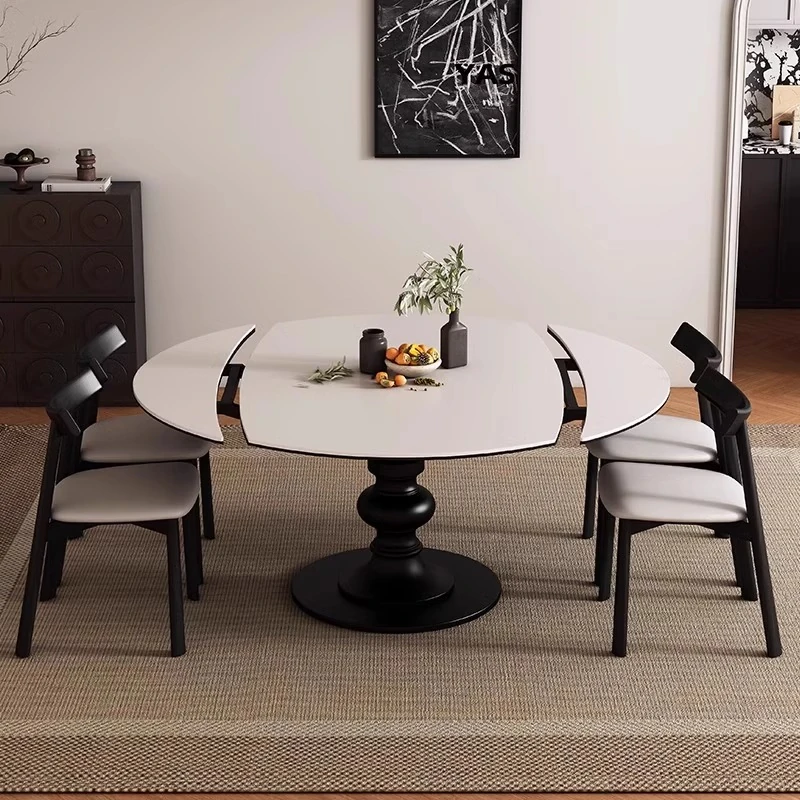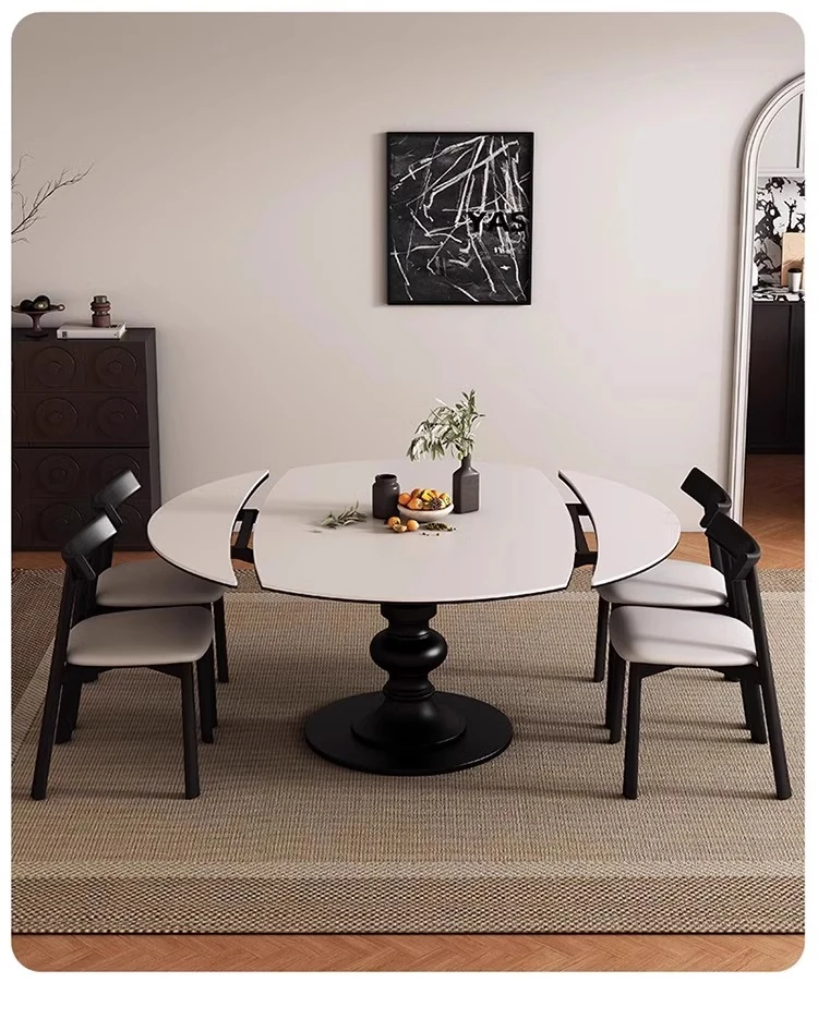 ヴィンテージ風の伸縮可能なラウンドダイニングテーブル - 高級感溢れるフレンチスタイル、小スペースに最適なスクエア&ラウンド両用、耐久性のある無垢材とロックストーンの洗練されたデザイン!