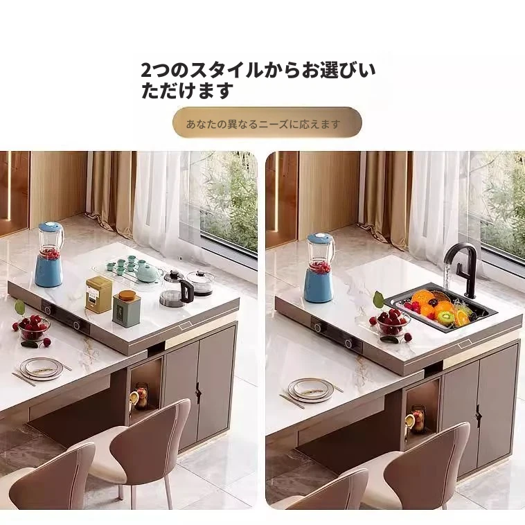モダンでラグジュアリーな多機能アイランドキッチン、シンク付きの高級バー台!伸縮可能なデザインで、開放的な空間を演出。おしゃれで実用的なダイニング体験を提供します。