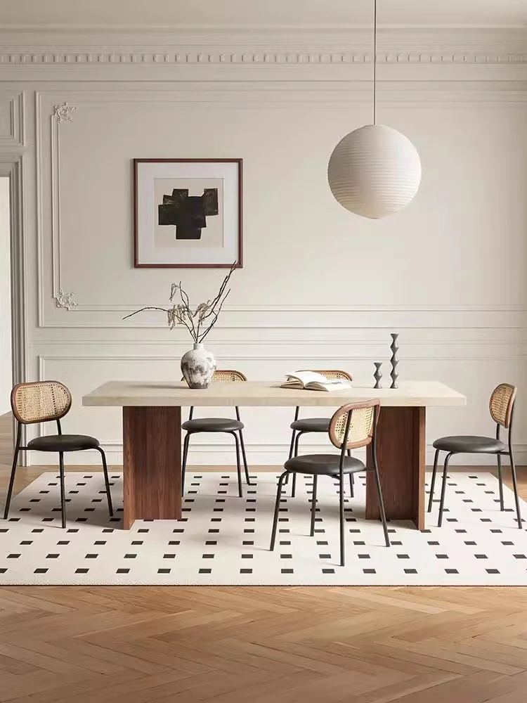 フランス風ヴィンテージ実木ホワイトアッシュダイニングテーブル、洞石岩板使用の現代的なシンプルデザイン、広々とした長方形の大きなテーブルで、贅沢な食事空間を演出します。